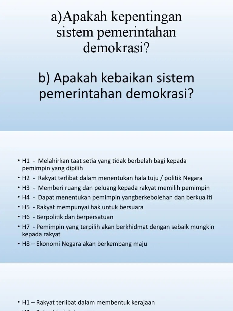 Kelebihan sistem demokrasi · (1) rakyat punya hak bersuara, · hak berpolitik & hak berpersatuan · (5) kerajaan yang lebih efisien dan stabil · (4) mengamalkan .